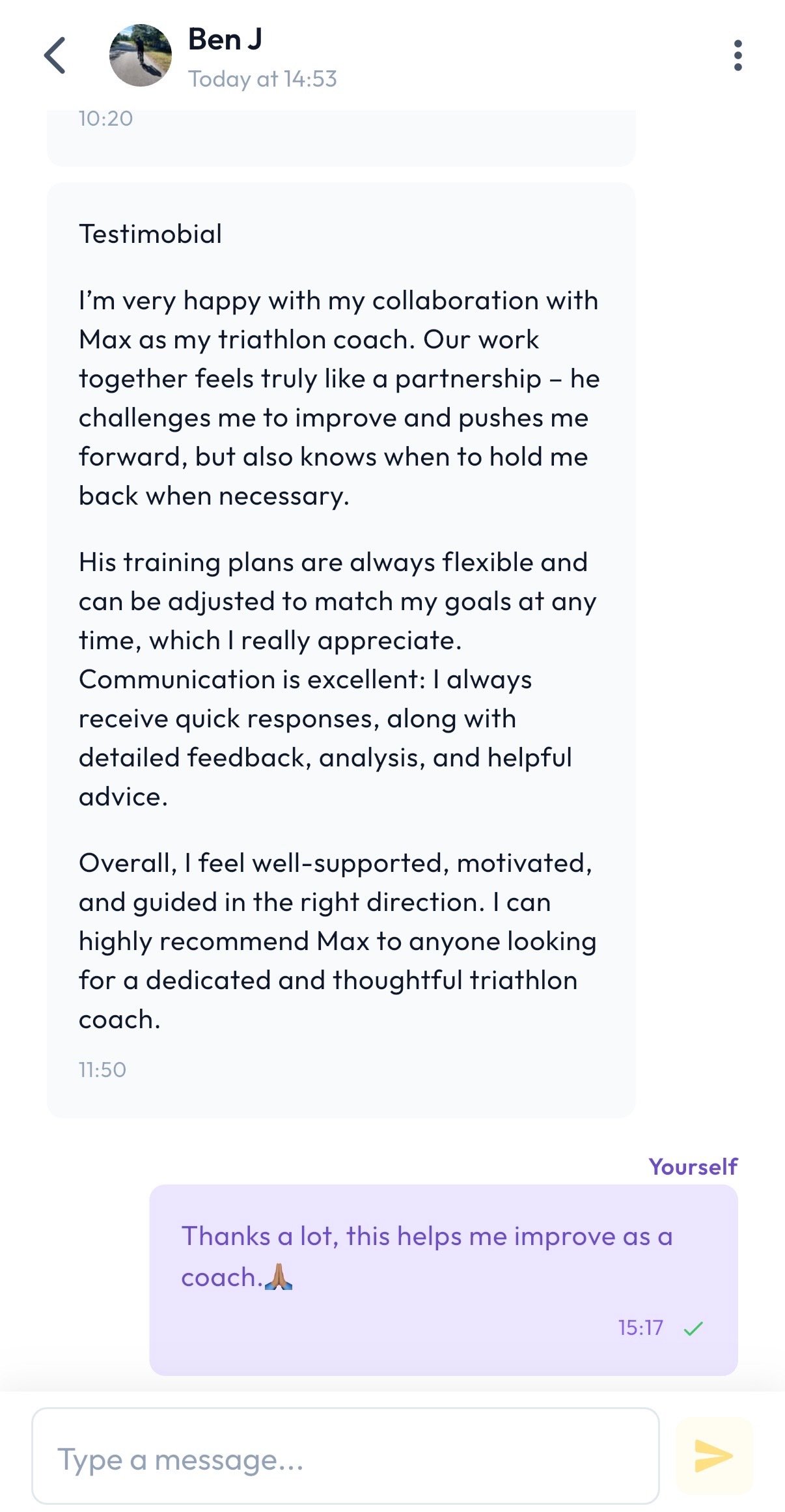 Overall, I feel well-supported, motivated, and guided in the right direction. I can highly recommend Max to anyone looking for a dedicated and thoughtful triathlon coach."